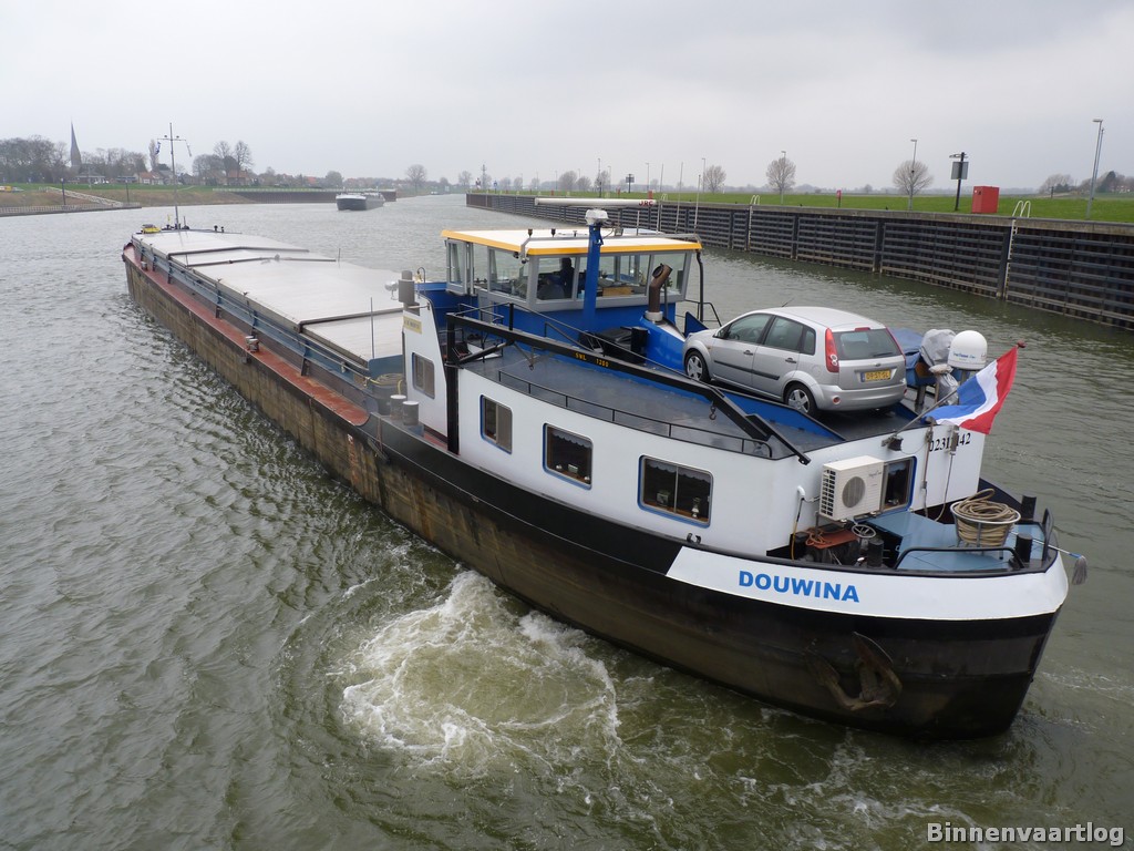 Douwina , 66,99 x 8,20 x 2,54 , 899 ton , Bouwjaar 1940 , Werf Jos Boel & Zn in Temse ( Belgie ) , 680 pk Caterpillar en 212 pk DAF boegschroef , ex Rhenus 140 , ex Rhenus 93 , ex Helena , ex Container , ex Anne , ex Relax , eigenaar Vof de Wachter - van Sluis in Spijkenisse , ENI 02312142
