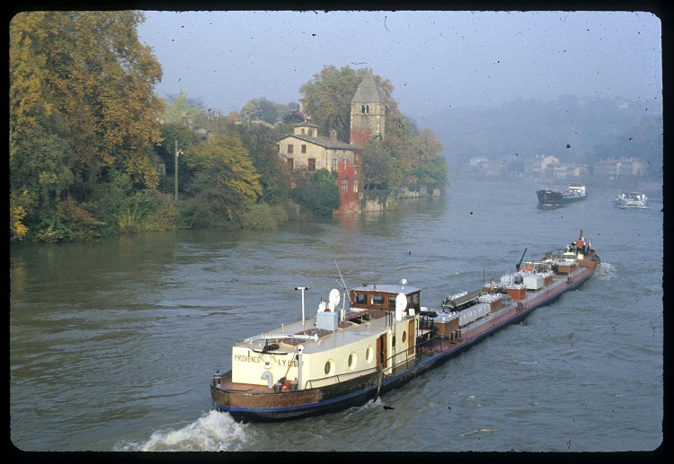 Je n'ai aucun souvenir de ce voyage exceptionnel (poussé à l'envers, tiré, en double), à travers la Seine, la Marne, le canal de la Marne à la Saône, la Saône, et nous arrivons à Saint-Fons-Lyon, le 15 septembre, puis vers le 15 novembre, Arles-Barriol où a lieu le raboutage. nous ne reflotterons qu'en juillet 1950. Barriol où l'on voit l'USHUAÏA en début de cette rubrique.