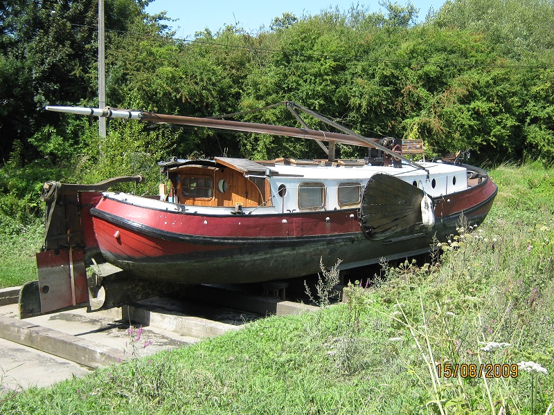 Un autre dont je ne connais pas la devise encore avec son mât, la derive et la barre franche. Il est dans la cale seche publique de Seneffe , Canal de Charleroi- Bruxelles