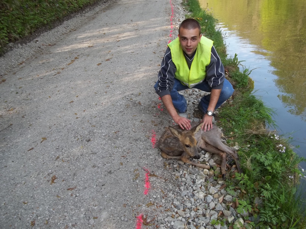 Je m'approche alors du chevreuil, qui a peur et se met à nager plus vite. Il ne fallait surtout pas qu'il s'éloigne vers le large où il aurait été hors de portée. Je vais donc l'attendre un peu plus loin, et quand il passe devant moi, nos regards se croisent. Il semblait me dire : "J'arrive, mon gars, ne me rate pas, parce que là je n'irai plus loin !". Couché sur le chemin de halage, je le saisis par les oreilles (seule partie accessible, vu que le bief était bas...). Je le tire hors de l'eau, et un de mes collègues le saisit par les pattes avant pour m'aider à le hisser sur la terre ferme.