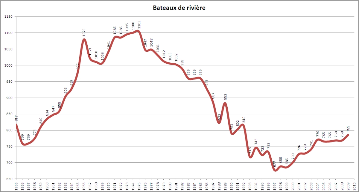 Avec près de 1400 bateaux, la flotte fluviale française offre une capacité d’emport de 1,14 million de tonnes. Le renforcement des grandes unités supérieures à 400 t) se confirme. Ces dernières représentent désormais plus de 90% de la capacité nationale de transport contre 50% en 2000. Cette modernisation de la cale rapproche la capacité moyenne des unités françaises (827 tonnes) de la moyenne européenne (1133 tonnes). La tendance est donc bien au renouvellement et à l’augmentation de la taille des bateaux. Sur ce point, l’année 2008 ne déroge pas à la règle avec l’arrivée, sur la Seine comme sur le Rhône, d’automoteurs géants pour le transport de conteneurs.