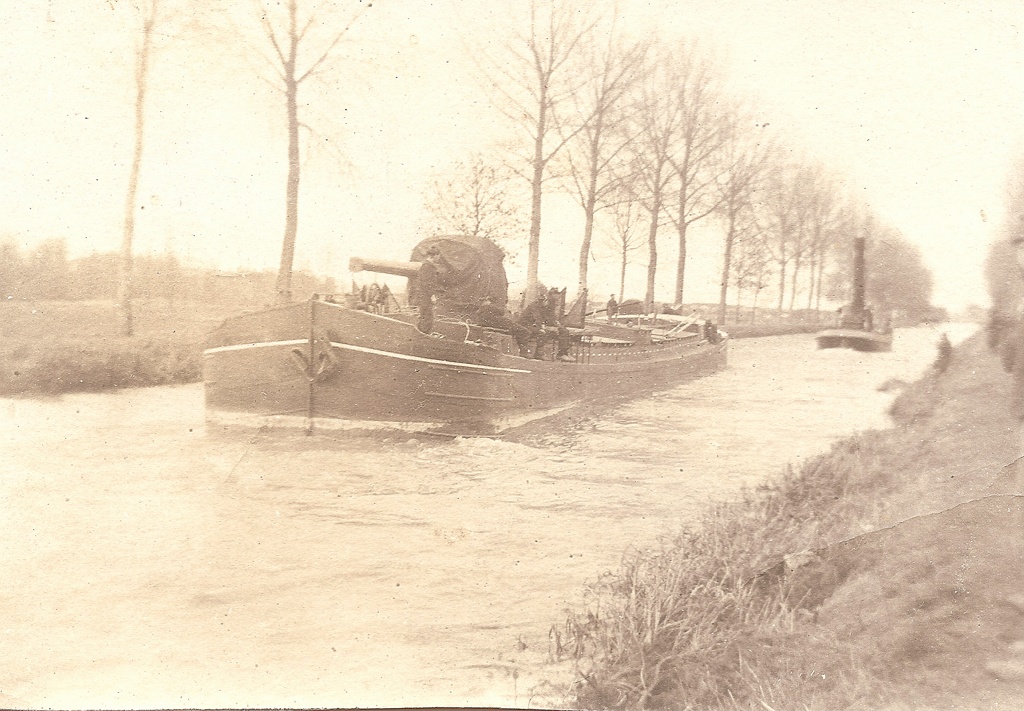 Dès 1914, l'Armée fait équiper des péniches de canon, pour combattre au plus près du front (Lorraine, Champagne, Somme, Nord). Voici quelques exemples relevés dans le rapport "Historique des batteries de canonniers marins et canonnières fluviales 1914-1919", rédigé par le contre-amiral Jehenne :