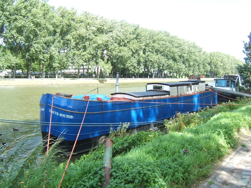 C'est le Chauve-Souris, ici a l’écluse d' Anderlecht. C'est un sabot ou baquet de Charleroi. La couleur bleu Titane de la coque, comme j'ai pu comprendre, est la couleur des premiers baquets ( en bois) construits en1827