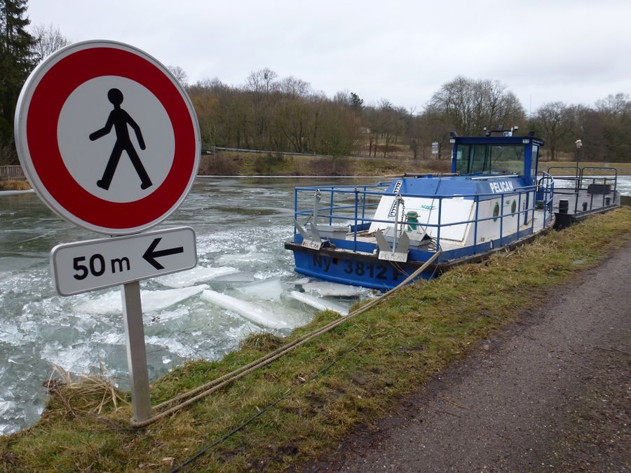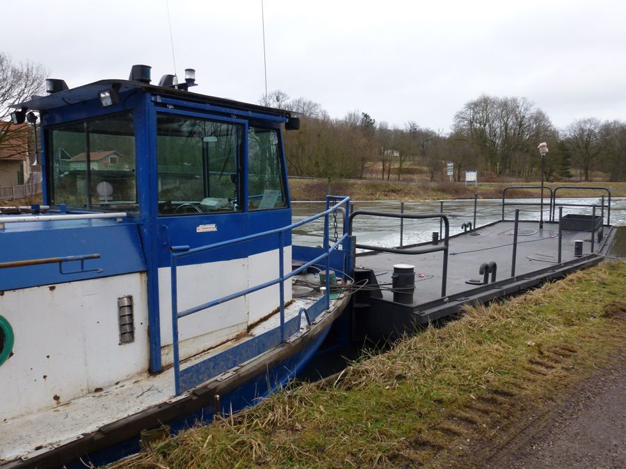 Les brise-glaces sont prêts... ici à Méréville (54), en amont de l'écluse 46, l'avant-dernière du canal des Vosges, versant Moselle, le pousseur :