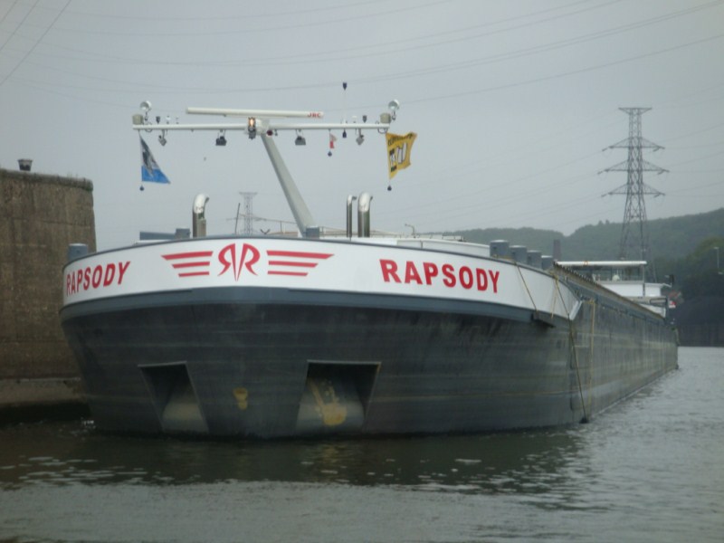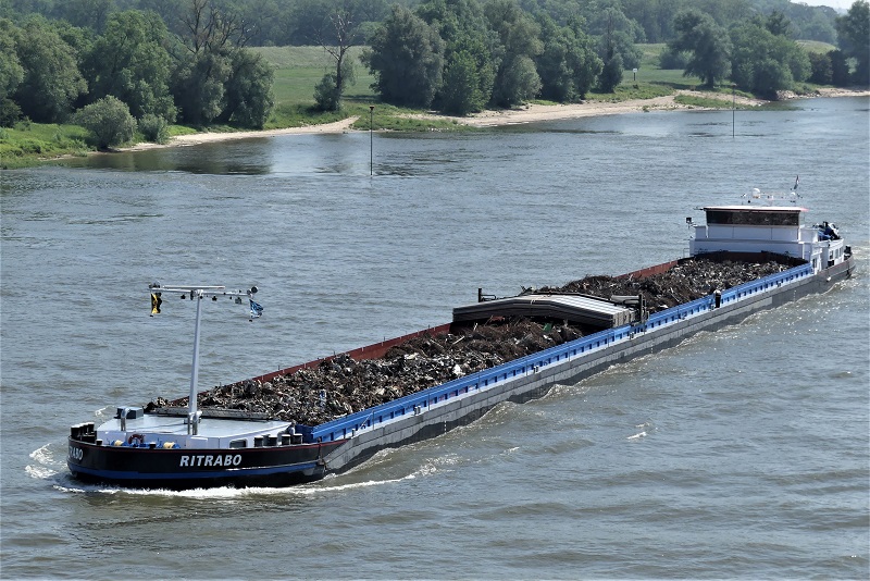C'est un habitué de la Moselle française, jusqu'au terminus de la navigation à grand gabarit ! Sur les photos de Christian, il est avalant, chargé de bobines de fil-machine, elles proviennent sûrement de la SAM, l'aciérie électrique de Neuves-Maisons. Quand il est montant, c'est avec de la ferraille qui sera fondue là-haut, comme par exemple ici, sur la Moselle canalisée à l'écluse de Villey-le-Sec, en août 2017 :