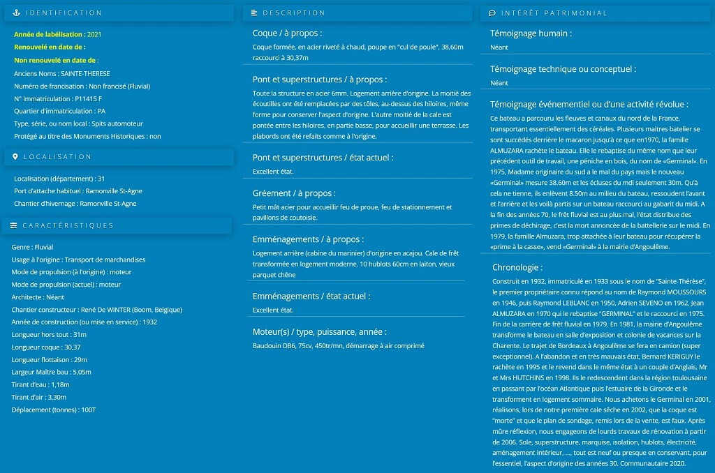 Le GERMINAL a été labellisé PATRIMOINE MARITIME ET FLUVIAL en 2021.