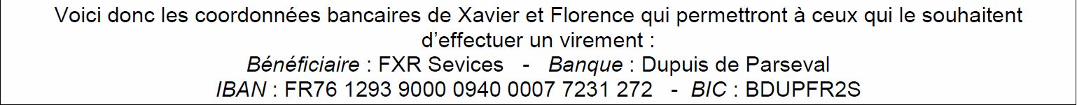 En compléments des courriers que je reçois à la pelle... Nous avons maintenant la possibilité d'effectuer un virement directement sur le compte de Florence & Xavier.