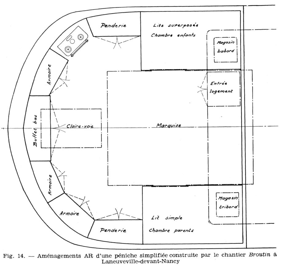 Les fig. 14 et 15 représentent les aménagements de deux péniches simplifiées.
