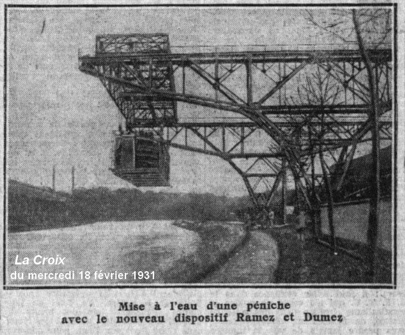 Les établissements Ramez et Dumez viennent de réaliser à Hautmont (Nord) un original appareil pour la mise à l'eau des péniches. Cette installation complète un chantier fluvial en bordure de la Sambre, ne gêne nullement la navigation et n’a nécessité aucune retouche à la rive de ladite rivière qui décrit une courbe en cet endroit.