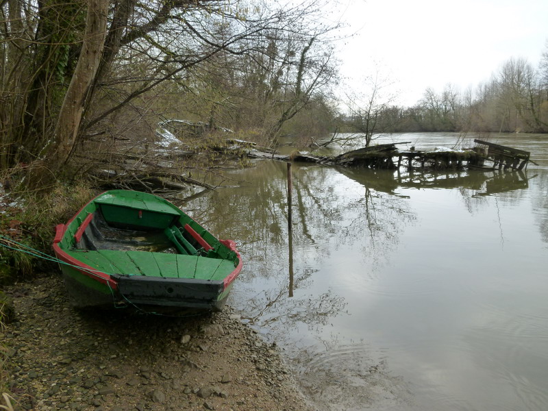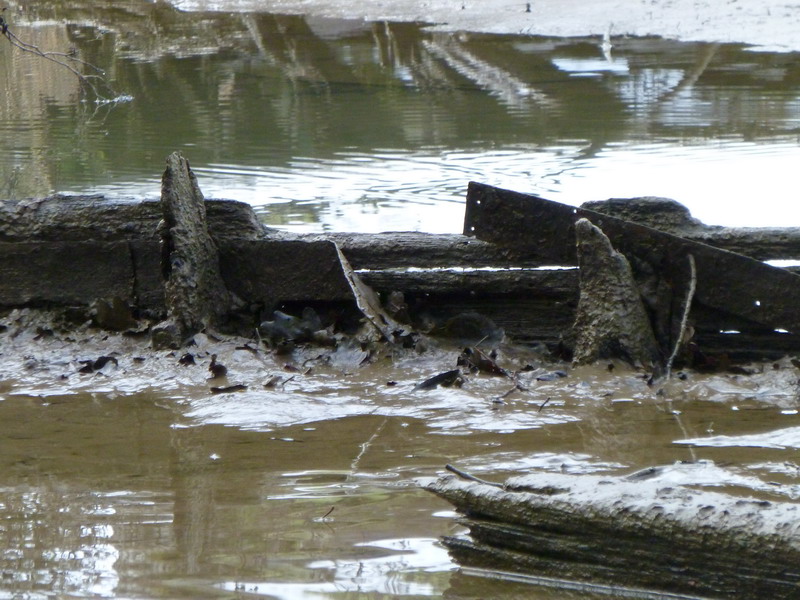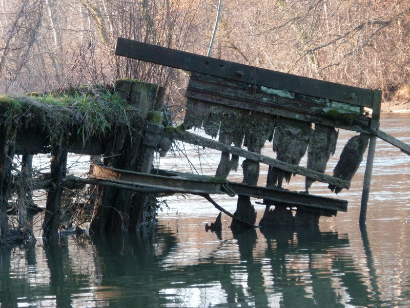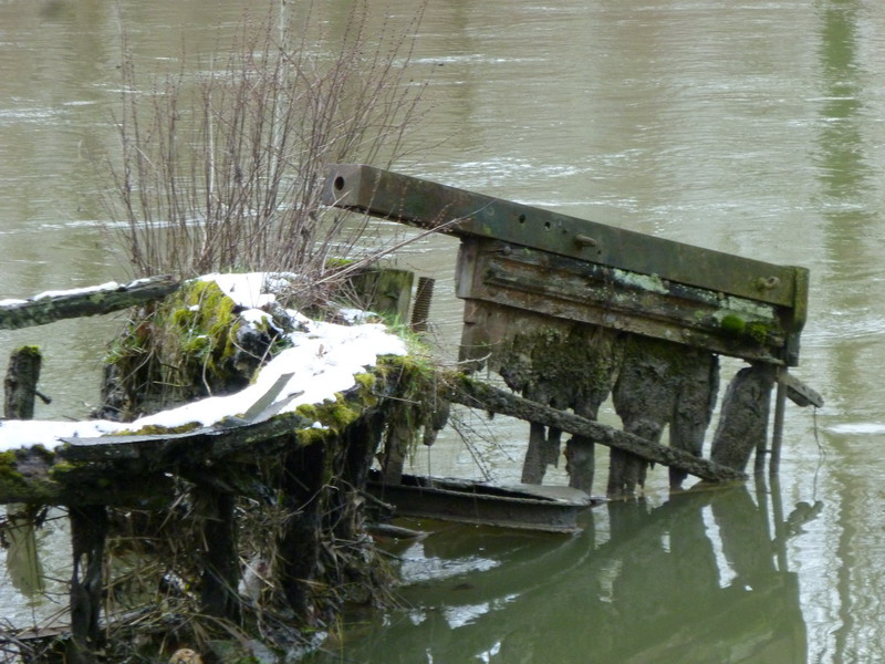 Grace à la crue, le barrage de Bassou est grand ouvert et crée un contrebas dans le bief. Les épaves sortent bien de l'eau. Jour de chance!