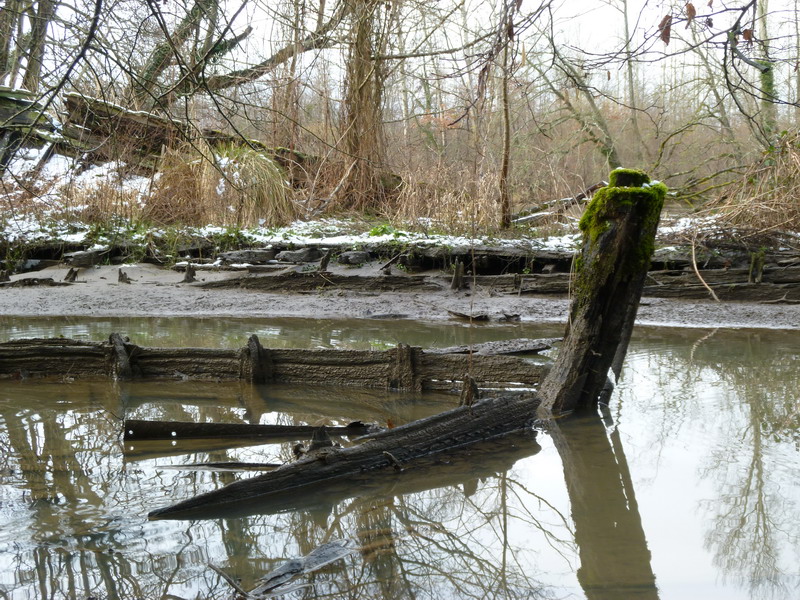 La carte fluviale de l'Yonne indique à cet endroit dans le bras mort "épaves vieux bateaux en bois"