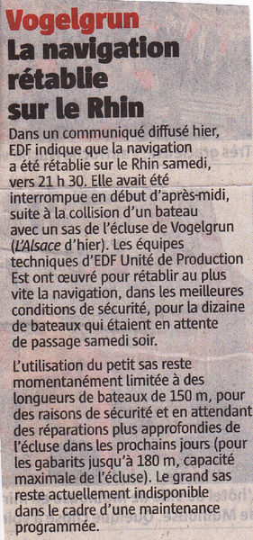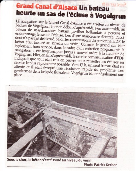 paru dans le journal l'Alsace de ce matin un bateau Hollandais a percuté l'entrée de l'écluse hier, voir article