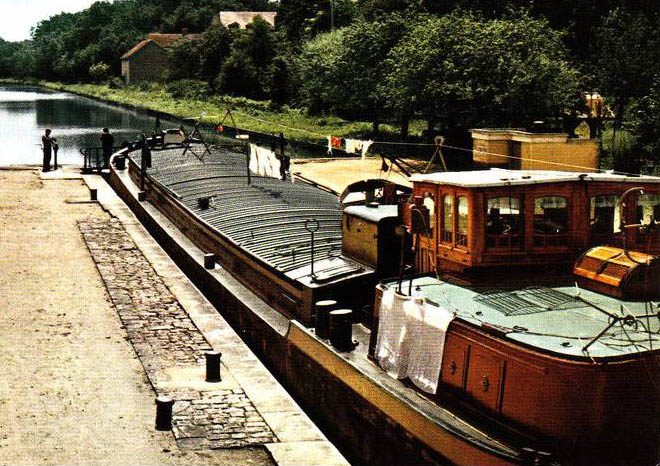 Puis je pense à une autre carte postale d'Amilly, que Guy a posté sur le forum, et qui ressemble un peu. Je la retrouve, elle est ici. On y voit le VIOLETTA entrant dans l'écluse, montant et chargé. On peut se dire : tiens, ça correspond ! C'est peut-être une de ces séries qu'on trouve parfois, l'éditeur qui choisit de publier plusieurs photos du même sujet... Ces séries que, justement, Guy apprécie particulièrement.