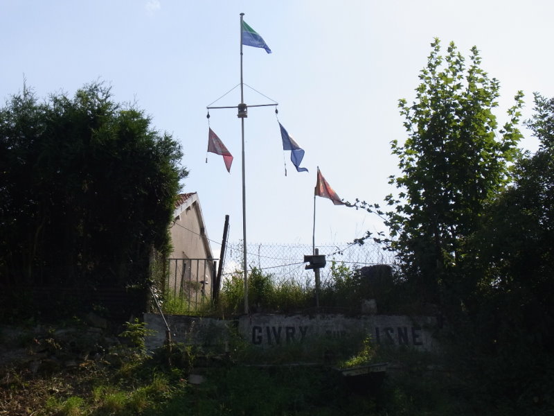 Givry-sur le Canal des Ardennes. Est-ce que Givry est - ou plutôt était - un village de bateliers ou est cet mât une decoration? Je ne sais pas. Le mât avec les drapeaux (je ne sais pas le mot francais - en allemand, cela serait un Schiffermast ("mât des bateliers") typique pour les villages de bateliers.
