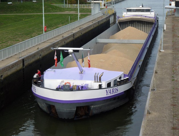 Yaris , 110,00 x 11,45 x 3,40 , 2949 ton , Bouwjaar 2004 , Werf Centromost Stocznia Rzeczna in Plock ( Polen ) en Veka BV in Werkendam ( Nederland ) , 2000 pk Cummins en 620 pk Cummins van Wijk boegschroef , ex Marie Joseph , eigenaar Ronald de Bier in Wijnegem , ENI 06004045