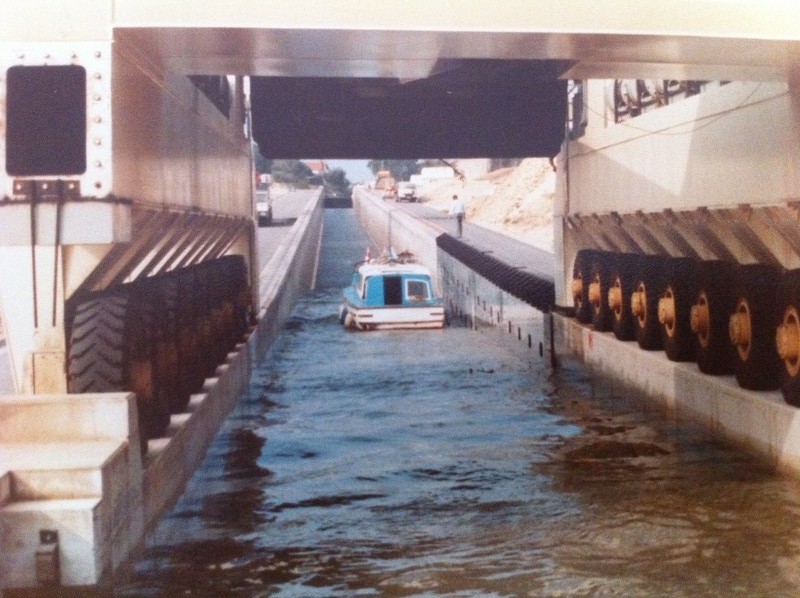 Tout pimpant neuf- on rigolait beaucoup pour le passer parce qu'a chaque passage il y avait un incident de parcours, souvent la flotte fuyait sous la pelle et il fallait laisser descendre un petit tsunami depuis la porte amont. Il a pas fonctionné longtemps, dans la pluie, avec le Papillon, on est descendu a 4 fois la vitesse normale avec les pneus qui glissait et le hydraulique qui ne freinait pas, la pelle a envoyé une vague de 1m20 a travers le pont canal sur l'Orb, et mise un batea de location en fâcheuse posture sur le chemin de halage. Apres cela, je ne suis jamais monté avec la machine un autre fois!