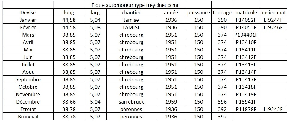 les tonnages de ces automoteurs est de l'époque d' avant la pose des cuves à ciment qui date environ des année 1962, le bruneval et l'étretat étaient des freycinets tractionnés qui ont été motorisés au moment de la pose des cuves à ciment en 62 environ je suis désolé mais je n'ais pas de photos de tous les bateaux cités