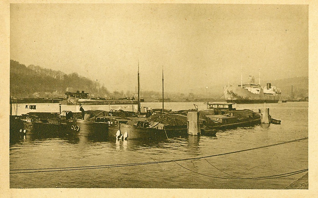 À Rouen, le grand pétrolier est le "Roussillon", seul nom lisible est "Guépard" pour le deuxième peniche