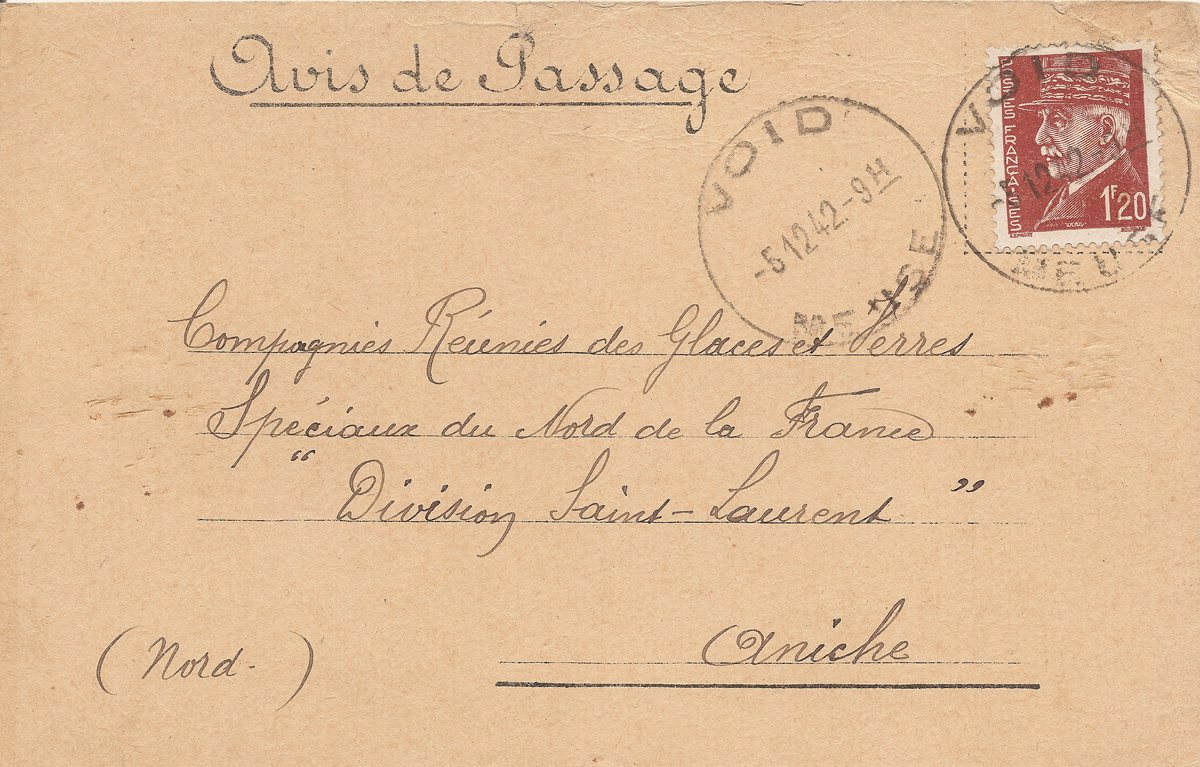 Il est destiné aux Compagnies Réunies des Glaces et Verres Spéciaux du Nord de la France, "Division Saint-Laurent", à Aniche, dans le Nord. Il a été posté à Void, dans la Meuse, le cinq décembre mille neuf cent quarante-deux, et affranchi par un timbre brun-rouge d'un franc et vingt centimes, à l'effigie du Maréchal Pétain, qui a été en circulation de janvier 1942 à novembre 1944.