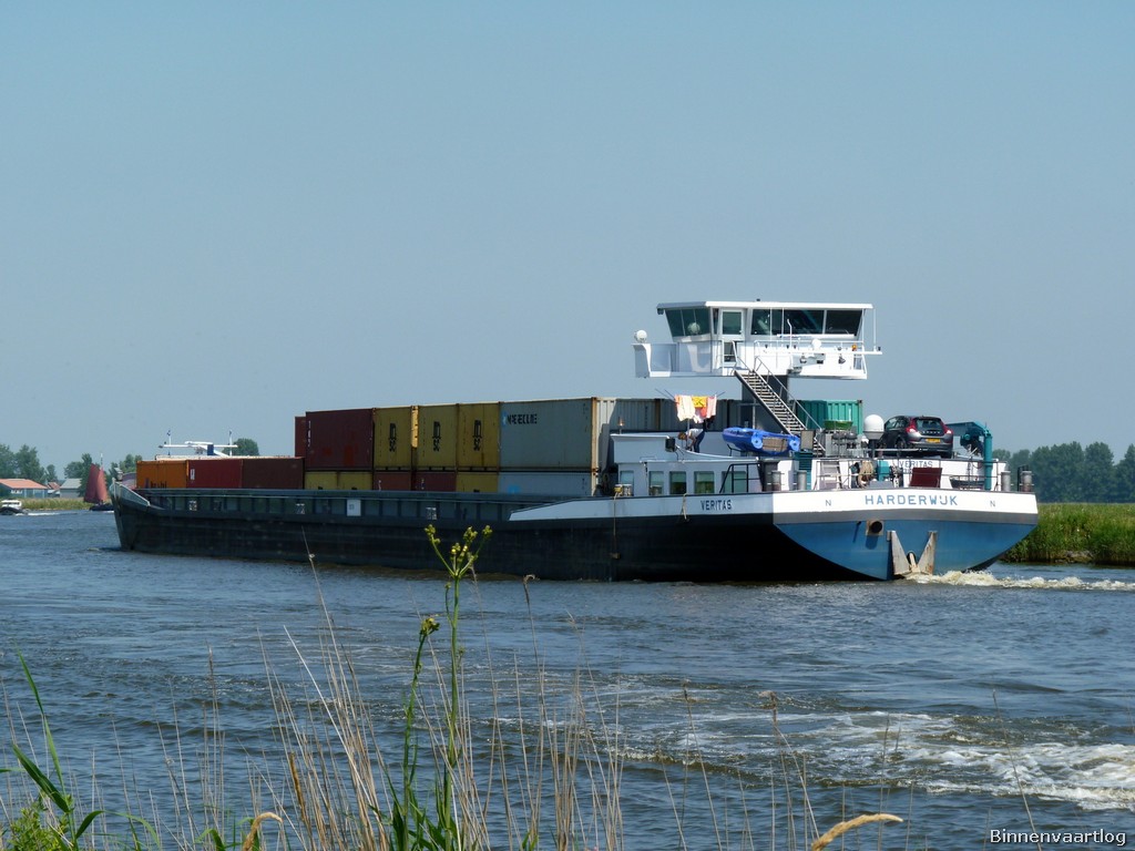 Veritas , 109,93 x 11,40 x 3,43 , 3010 ton , Bouwjaar 1986 , Werf Alblas in hendrik Ido Ambacht ( Nederland ) en Dolderman in Dordrecht ( Nederland ) , 2028 pk Caterpillar en 480 pk DAF Veth-Jet boegschroef , ex St.Antonius , ex Victor , ex Rean-L , eigenaar Vof Veritas in Harderwijk , ENI 02317734