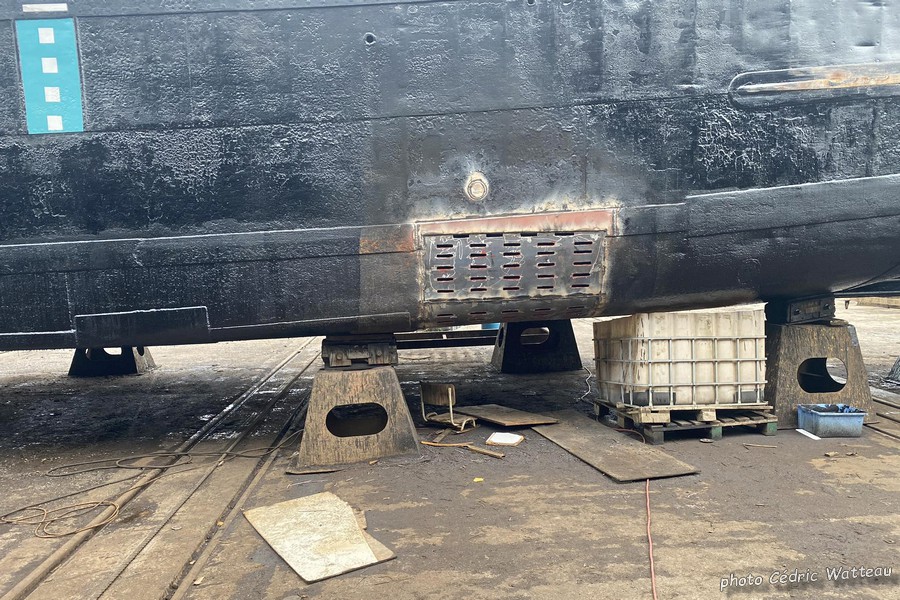 Cédric, après avoir vidé à Reims des coils venant de Kallo (B), partait à vide au chantier du Pont-de-Loup (B), pour remplacer son keel-cooling (système de refroidissement par serpentin fixé à la quille) qu'on peut voir sur cette photo, au bout de la flèche jaune...