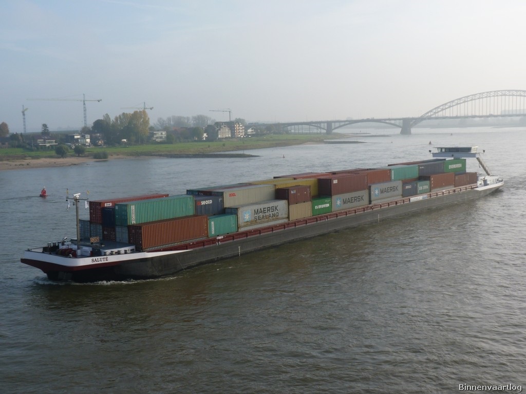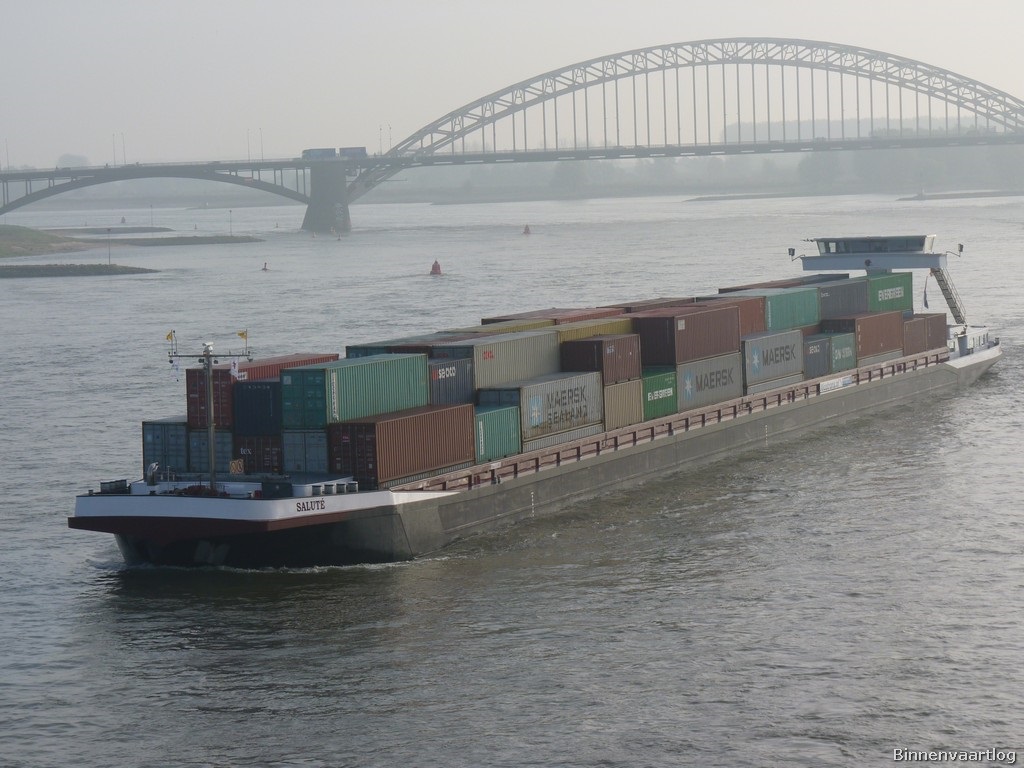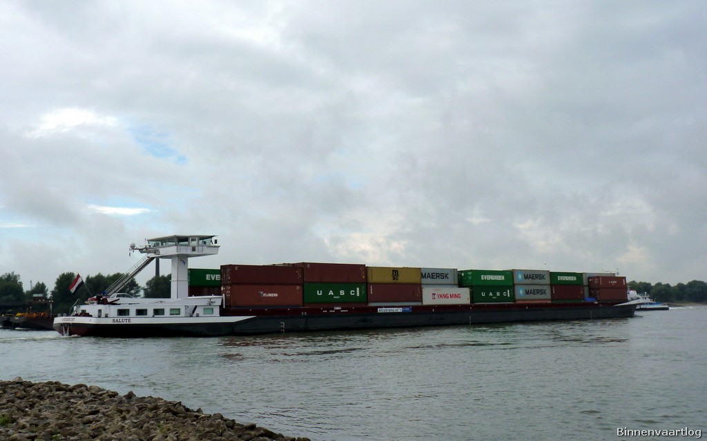 Salute , 134,97 x 14,20 x 3,80 , 5208 ton , Bouwjaar 2001 , Werf Taizhou Kouan Shipbuilding in Taizhou ( China ) en De Gerlien van Tiem in Druten ( Nederland ) , 2 x 1379 pk Caterpillar en 1014 pk Caterpillar – Veth-Jet boegschroef , ex Maria-D , eigenaar Saluta BV ( H & R.Pikaart ) in Papendrecht , ENI 02325047