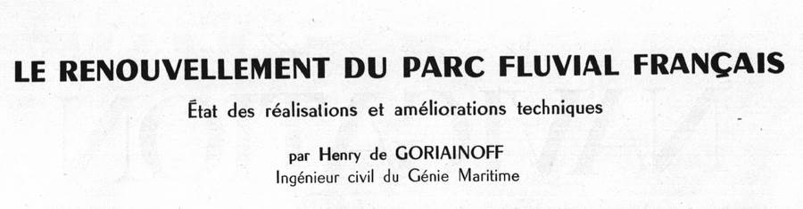 Voici un article très intéressant du numéro de la Revue de la navigation intérieure et rhénane du 10 juillet 1958 : écrit par Henry de Goriainoff, ingénieur civil du Génie maritime, il présente les réalisations et améliorations techniques apportées au renouvellement du parc fluvial français par la SRPF.