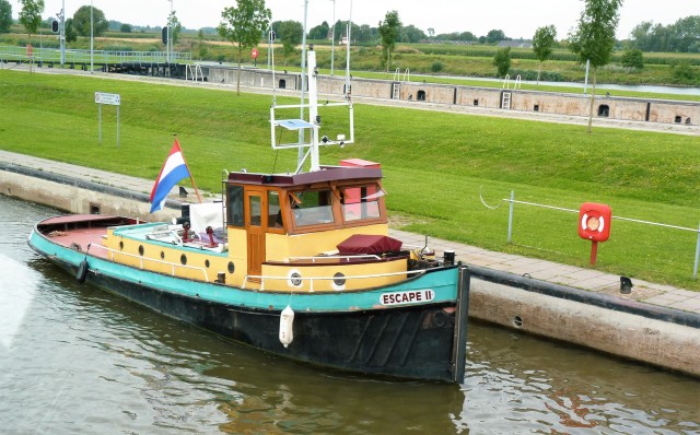 Escape II , 14,40 x 3,55 x 1,60 , Bouwjaar 1930 , Werf Bodewes in Hoogezand ( Nederland ) , 155 pk Deutz , ex Jitske , ex Julia , ex Hereli , ex Content , ex Teujo , ex Ger , ex Hera II , eigenaar A.F.van.Schijndel in Vinkel , ENI 02203490