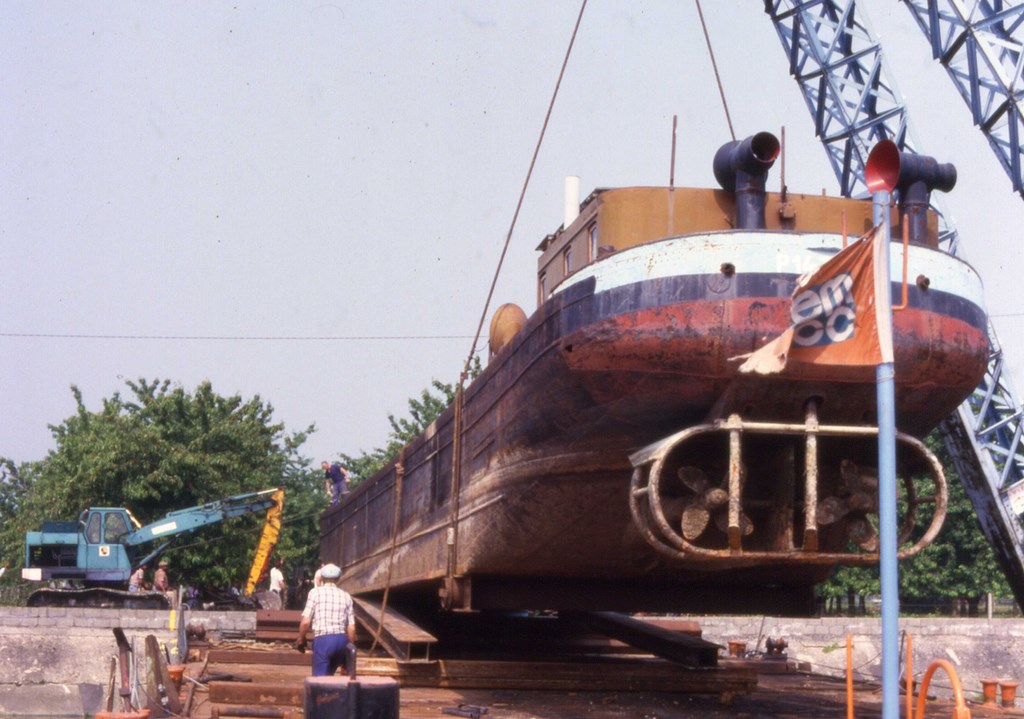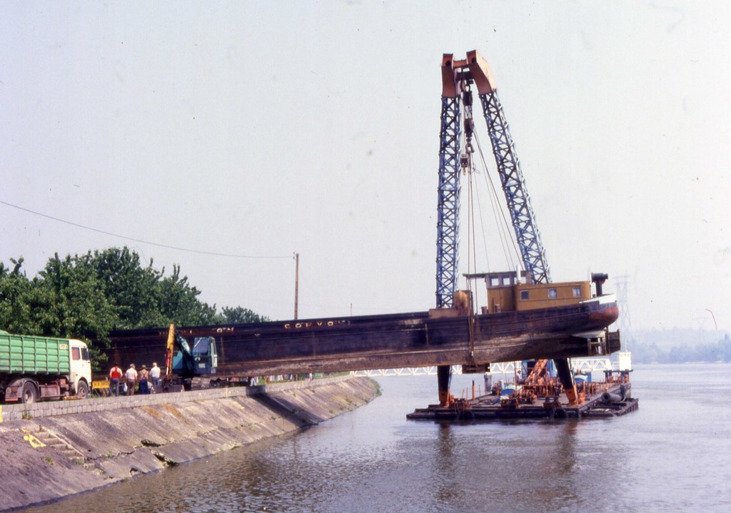 Le bateau qui avait été acheté par l’exploitant d’une tourbière de Heurteauville a été mis sur une barge, à l’aval de Rouen à l’aide d’une grue et d’une bigue, avec la partie avant qui dépassait de la barge.