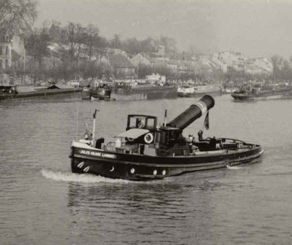 J'ai du mal à comprendre ce qu'on voit, sur cette photo : le DOUBS est tiré par le côté, c'est ça ? est-ce une mise à l'eau ? Le quai est en pente... Si on regarde les piles du pont, on voit des marques laissées par l'eau, ça veut peut-être dire qu'il y a eu une crue juste avant. Et au premier plan au sol, ça paraît bien mouillé, comme si l'eau venait juste de se retirer, n'est-ce pas ? Ne peut-on pas imaginer que le DOUBS s'est retrouvé en fâcheuse posture sur le quai lors d'une inondation, et que le LUCILINE est venu le tirer de là ? et c'est pour ça qu'il y a de nombreux badauds sur le pont et les quais...Sur la photo, le