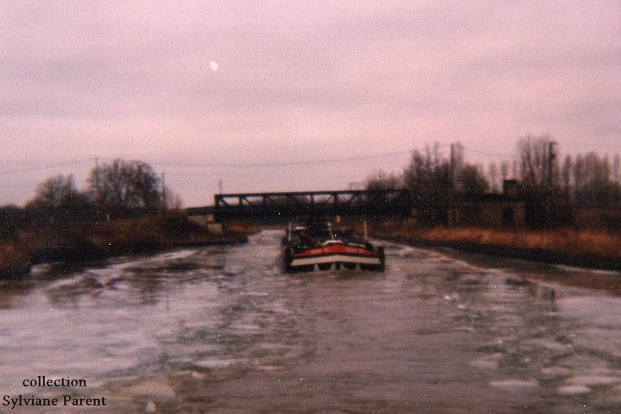 Petite anecdote : il est chargé, sur cette photo ! Car en réalité, pour cause de glace et afin de pas abîmer les barrages a aiguilles de la Meuse, ceux-ci ont été couchés, ce qui a entraîné une baisse d’eau dans le chenal.