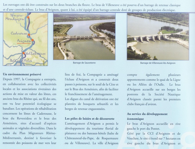 "Au premier semestre (1973) , on constate que dorénavant, le passage se fait par le nouvel aménagement d'Avignon. Il est constitué par l'écluse-usine de Villeneuve-les-Avignon, le barrage usine de Sauveterre sur l'ancien Rhône, et un autre barrage sur le bras de Villeneuve. L'originalité de ce plan consiste à utiliser comme portion navigable, l'ancien bras mort de Villeneuve (en rive droite, comme à Beauchastel), au lieu de la grande boucle d'Avignon. C'est à dire que maintenant, les bateaux passent à l'ouest de l'île Piot et de l'île de La Bartelasse. La dérivation est donc très courte, et permet de gagner plus de quatre kilomètres. La passage du côté d'Avignon devient un cul de sac mais permet néanmoins d'atteindre, le dépôt d'hydrocarbures du Pontet et le port de L'Oseraie grâce à la remontée d'eau du barrage aval de Vallabrègues." ....Mais aussi parce que, pour la première fois, le barrage de retenue, de Sauveterre, est équipé d'une turbine qui permet de laisser passer l'eau sans perdre son énergie.
