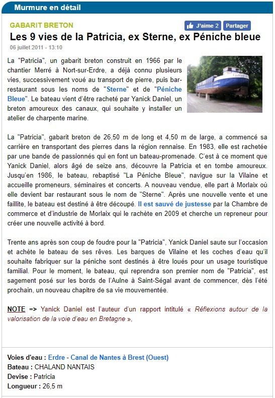 La Patricia est l’unique et dernière péniche bretonne en Finistère encore capable de naviguer. Construite en 1966 cette dernière s’appela La Sterne puis la Péniche Bleue. Ses mensurations ont de quoi faire rêver les amoureux de la navigation : 26,50 m de long et 4,50 m de large pour un poids de 45 tonnes.".