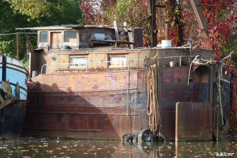 LENA, le montage composé de deux culs de bateaux face à face, au chantier Wirotius ; construction qui a été tirée à terre il y a quelques mois, qui doit en cours de déchirage ou même déjà déchirée :
