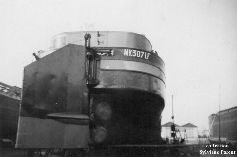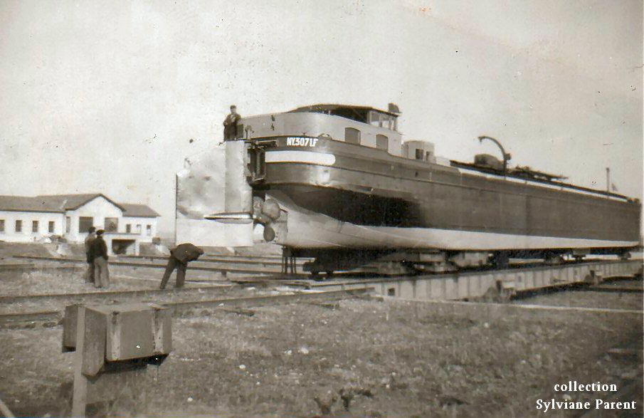 Le SOLVAY 103 dans le pont-canal de Troussey (55), sur le canal de la Marne au Rhin, avec, sur les veûles, Joseph Dutremez (père) et son épouse Georgina, dite Maria. C'est Joseph Dutremez (père) qui est allé chercher le 103 à sa sortie du chantier, en 1931. Le couple plus jeune, c'est Joseph Dutremez (fils), assis sur les fargues, et son épouse Denise :