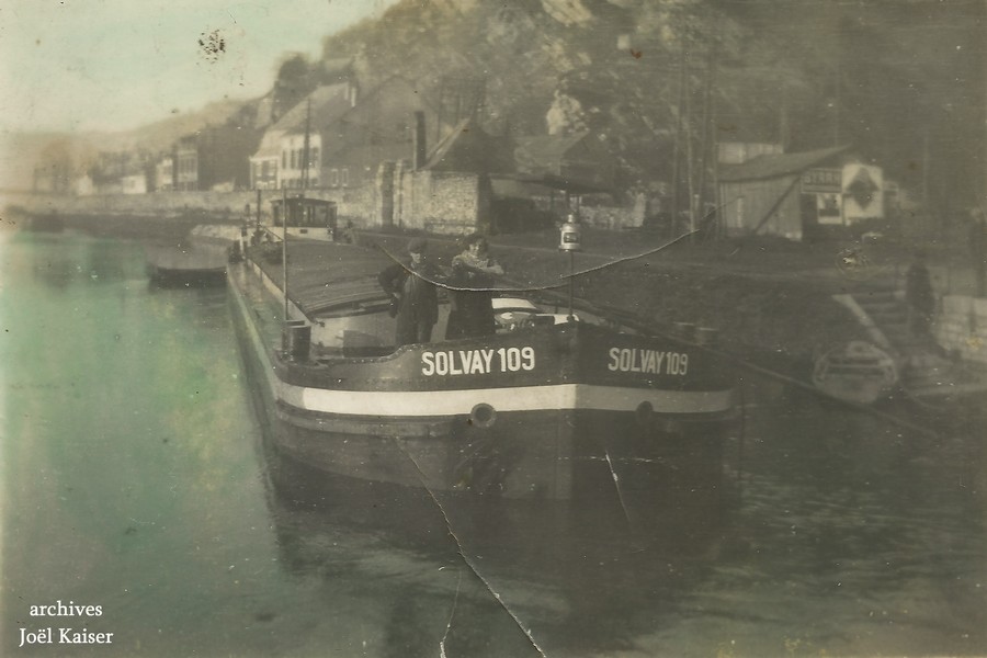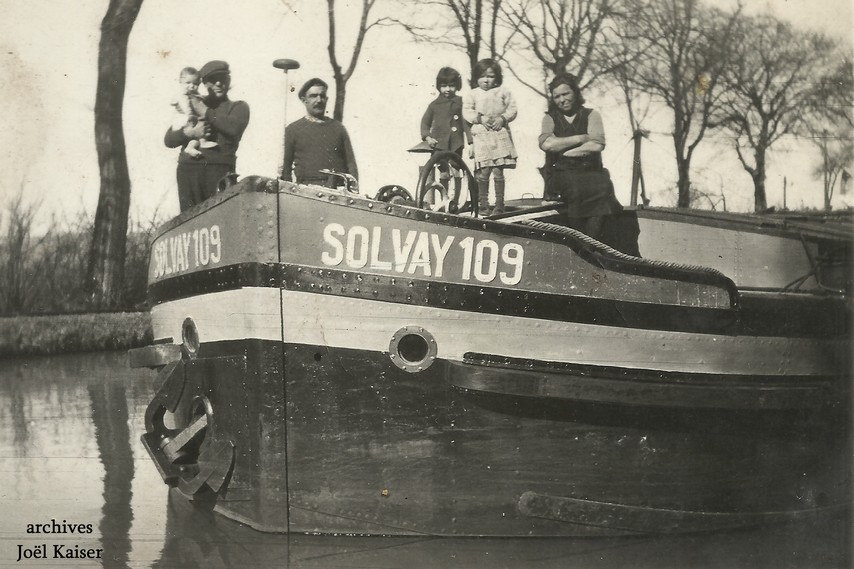 Les caractéristiques du SOLVAY 109 dans les années 30 : 38,45m x 5,05m - 393,46t à 2,60m - moteur Deutz-Diesel 30cv.