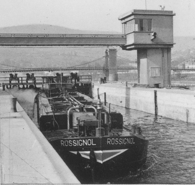 Ecluse de Couzon. A l'époque le mirador (ou poste de commandes) était en rive droite.