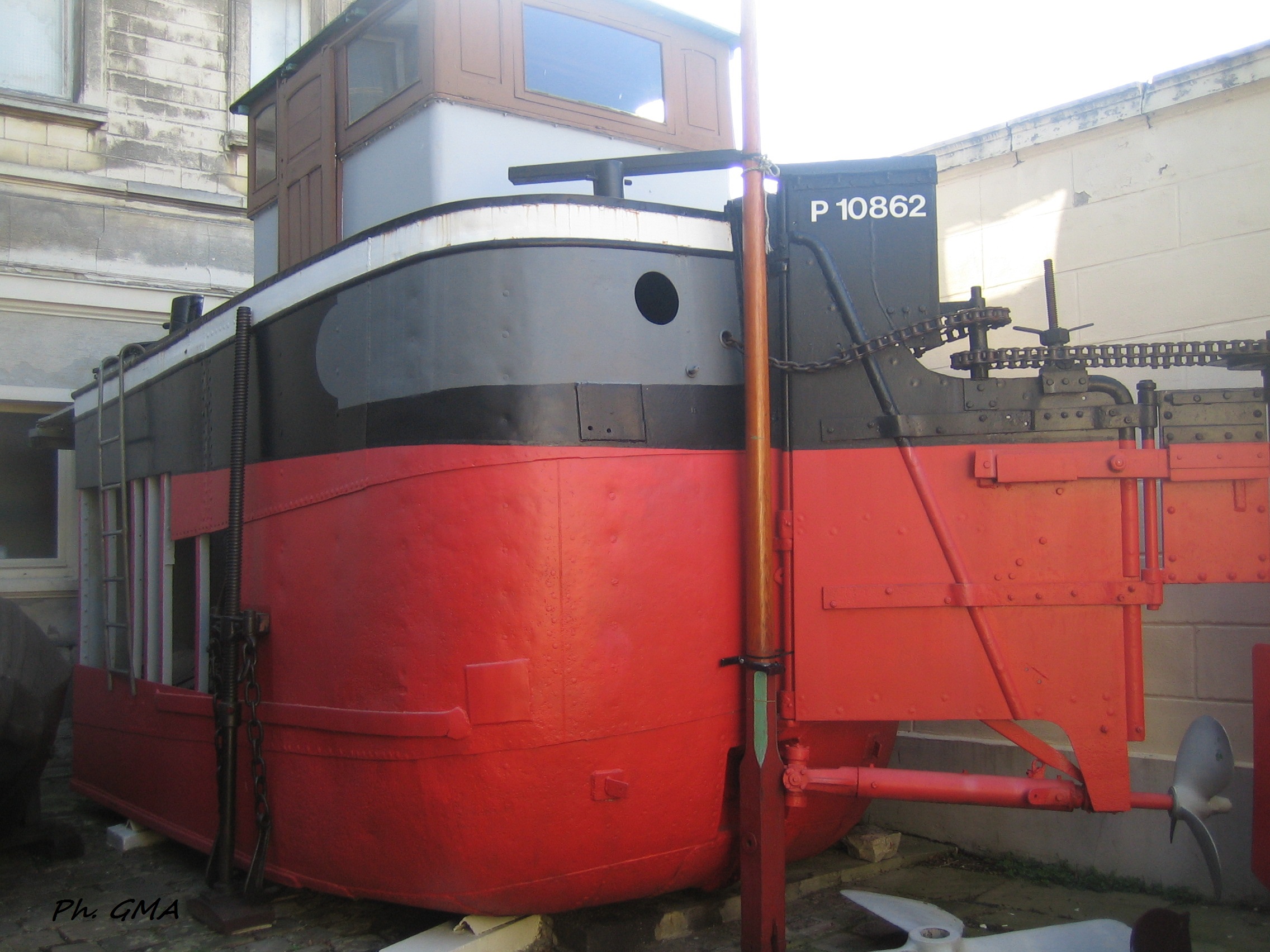 Je ne l'avais pas encore mis car je le voulais en navigation, du moins sur l'eau comme ici lors de son transbordement au chantier avant transport de l'arriere au Musée de Conflans
