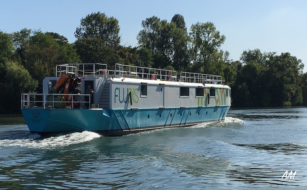 Nouvel arrivant en Seine, Fludis (01841341), un bateau neuf, a propulsion électrique sur batteries, qui fera Gennevilliers <-> Paris quotidiennement pour livrer des colis au client final avec des triporteurs. ( il y a quand même un groupe pour recharger les batteries.. ) Le bateau est conçu pour naviguer dans les deux sens, pour éviter de virer en canal. (Construit à Meuse et Sambre)