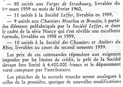 La construction en acier Thomas ou en acier Martin, les timoneries abaissées de 18cm, les bateaux avec ou sans cambuse, on y apprend plein de chose sur les raisons qui ont fait tous ces petits détails des productions en grande série de la société Leffer de Sarrebruck et des Forges de Strasbourg. Et on lit aussi que ce qui est rentré dans le langage courant batelier sous le nom de "mixte", c'est à dire les bateaux avec l'avant et l'arrière construits par la société Leffer et la partie centrale et l'aménagement par les chantiers Mourlon et Broutin s'appelait à la SRPF la "série Nancy".