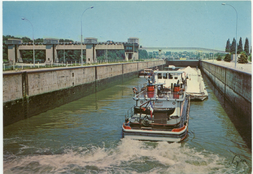 on devine sur la photo que ses barges ne sont encore pas equipées de treuils,les premiers convois etaient de 4 barges assemblées avec ce qu on apellait des" ridoirs" ou autres" verins"des engins qui devaient peser dans les 60 kilos a chaine et cable d acier et a pas de vis que l on manoeuvrait avec un especes de levier a cran reversible.les treuils sont apparus dans les années 70 avec l arrivée des premieres barges construites ailleurs qu a DRAVEIL.quand on quittait les barges il fallait recuperer les verins pour assembler d autres barges.(le soir tu pouvait te gratter les pieds sans plier les jambes)