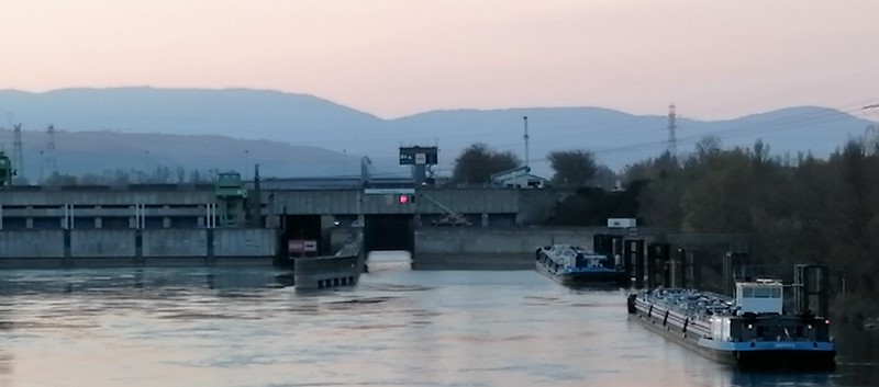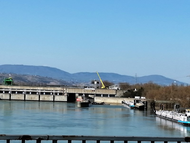 -Au niveau de l'emplacement de la porte aval, rive gauche l'on voit un échafaudage, un camion et une grue en activité au pied du mirador.