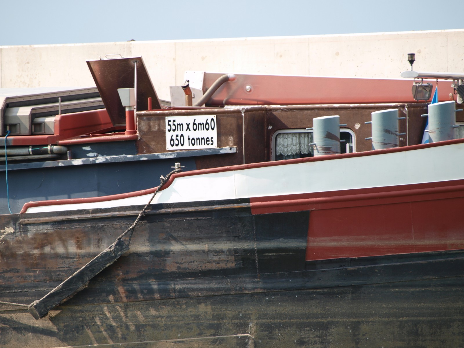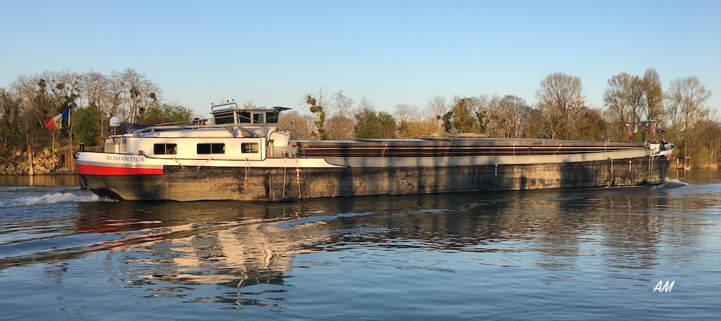 Une autre vue de ce joli bateau à l'amont de l'écluse de Varennes sur Seine. Le ROMANTICA plein bac bourre l'eau pour prendre la bassinée du ELO-YAN qui est déjà dans le sas.
