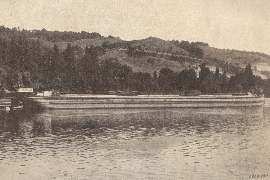 Dans "La navigation intérieure française", numéro spécial de La Navigation du Rhin édité à l'occasion de l'Exposition Internationale de Navigation Intérieure et d'Exploitation des Forces Hydrauliques de Bâle en 1926, on trouve cette photo d'un chaland en béton armé dont la devise est lisible sur la marquise :