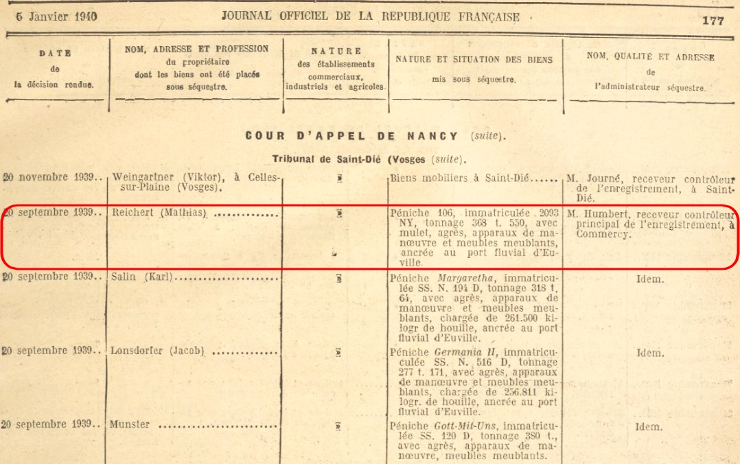 Nom, adresse et profession du propriétaire dont les biens ont été placés sous séquestre : Reichert (Mathias).