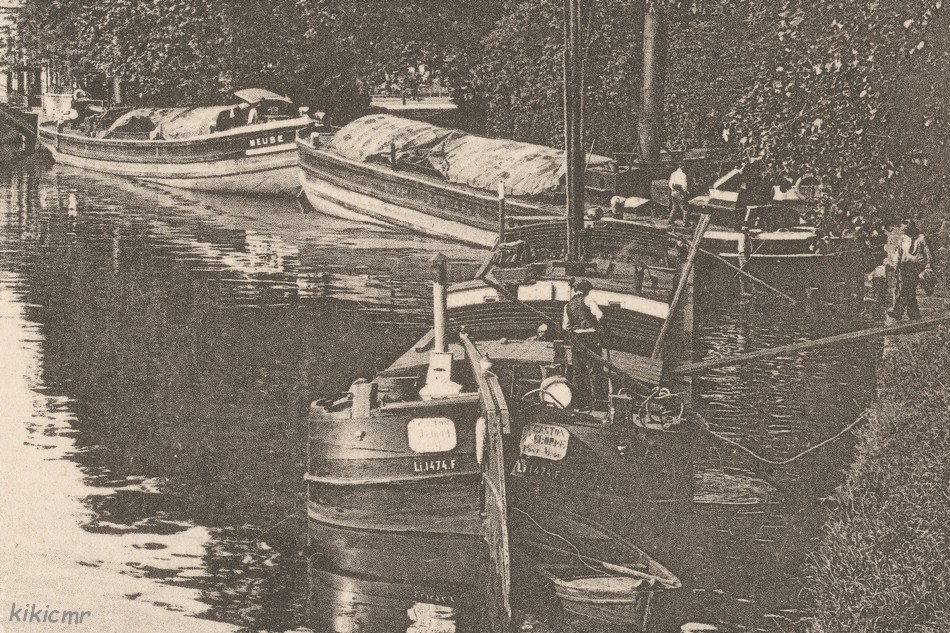 On peut voir, au premier plan, la péniche JEUNE GASTON, et devant elle, deux porteurs à vapeur ; suivant la date où la photo a été prise, ils appartiennent soit à la société Pavot Frères (disons que c'est si la photo date d'avant 1904 environ), soit aux Messageries Fluviales de France (si la photo est plus récente, sur une période s'étalant de 1904 à 1908 environ) ; le premier n'est pas identifiable, mais on voit bien la devise de celui qui est à l'arrière-plan, c'est le