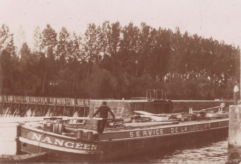 NANCÉEN est un bateau-citerne ; on peut lire sur les cuves : SERVICE DE LA LUCILINE - ROUEN. Luciline était le nom d'un combustible, produit par la raffinerie du même nom, à Rouen.