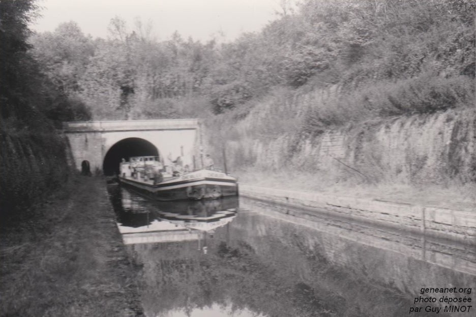 Un bateau-citerne sortant de la voûte de Balesmes (52), sur le canal d'Heuilley, en 1961 ; la photo est un peu floue, mais la devise lisible :