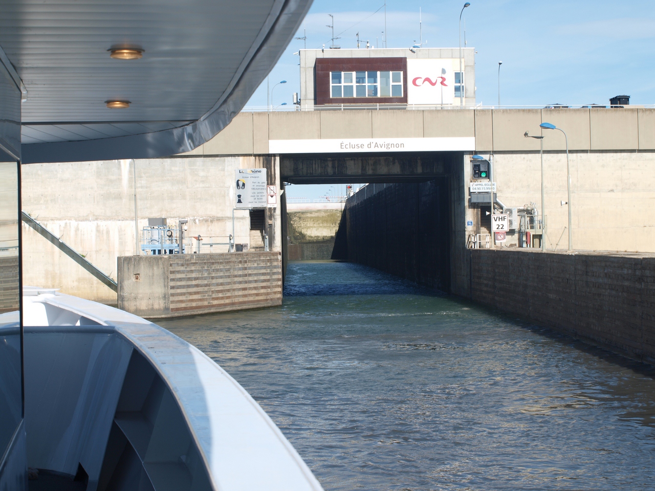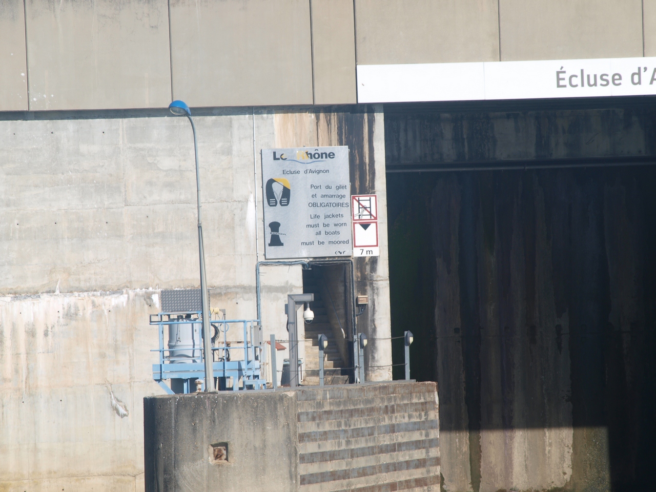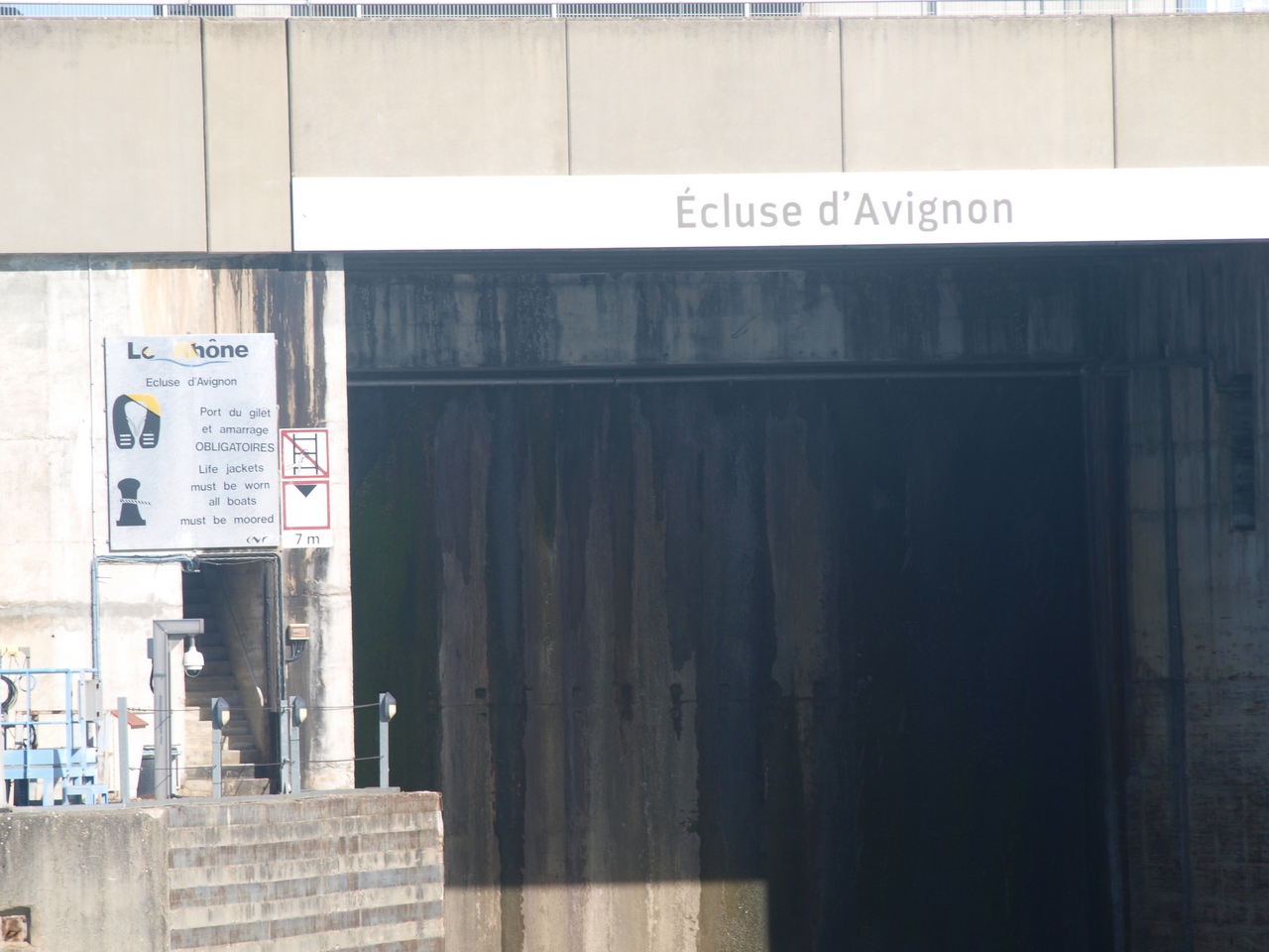 "Au premier semestre (1973) , on constate que dorénavant, le passage se fait par le nouvel aménagement d'Avignon. Il est constitué par l'écluse-usine de Villeneuve-les-Avignon, le barrage usine de Sauveterre sur l'ancien Rhône, et un autre barrage sur le bras de Villeneuve. L'originalité de ce plan consiste à utiliser comme portion navigable, l'ancien bras mort de Villeneuve (en rive droite, comme à Beauchastel), au lieu de la grande boucle d'Avignon. C'est à dire que maintenant, les bateaux passent à l'ouest de l'île Piot et de l'île de La Bartelasse. La dérivation est donc très courte, et permet de gagner plus de quatre kilomètres. La passage du côté d'Avignon devient un cul de sac mais permet néanmoins d'atteindre, le dépôt d'hydrocarbures du Pontet et le port de L'Oseraie grâce à la remontée d'eau du barrage aval de Vallabrègues." ....Mais aussi parce que, pour la première fois, le barrage de retenue, de Sauveterre, est équipé d'une turbine qui permet de laisser passer l'eau sans perdre son énergie.