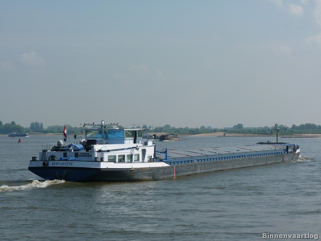 Bernadette , 110,00 x 11,45 x 3,45 , 3009 ton , Bouwjaar 2002 , Werf Centromost Stcznia Rzeczna in Plock ( Polen ) en De Gerlien – van Tiem in Druten ( Nederland ) , 1700 pk Mitsubishi en 791 pk MTU – van Tiem boegschroef , ex Bernadette , eigenaar Bernadette BV ( J.Pott ) in Nijmegen , ENI 02325642
